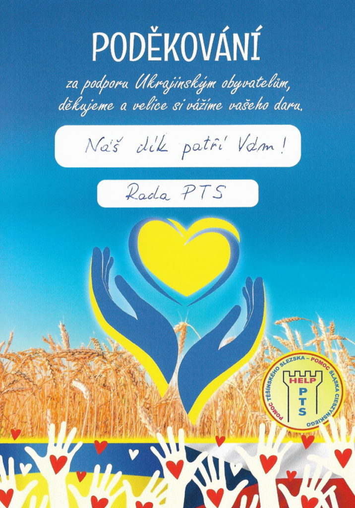 Děkujeme Vám všem, kteří jste finančně nebo materiálně podpořili Ukrajinu v těžké válečné době. Pomoc Těšínského Slezska neprodleně předala Váš dar naším partnerům na Zakarpatské Ukrajině, kteří se humanitárně starají o uprchlíky ze zasažených válkou měst a vesnic Ukrajiny. Mnozí z nich hledají pomoc právě na Zakarpatské Ukrajině, kde je zatím relativně klidněji. Bohužel na mnohé doléhá právě nedostatek potravin a základních životních potřeb.